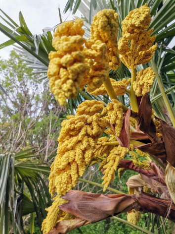 En début de saison, appaîssent de spectaculaires infloressences en forme de grappes composées de millier de petites fleurs jaunes. Cette floraison peut fructifier et laisser place à de nombreuses graines noires qui, une fois au sol, germent sans soucis et donnent naissance à de petits palmiers.